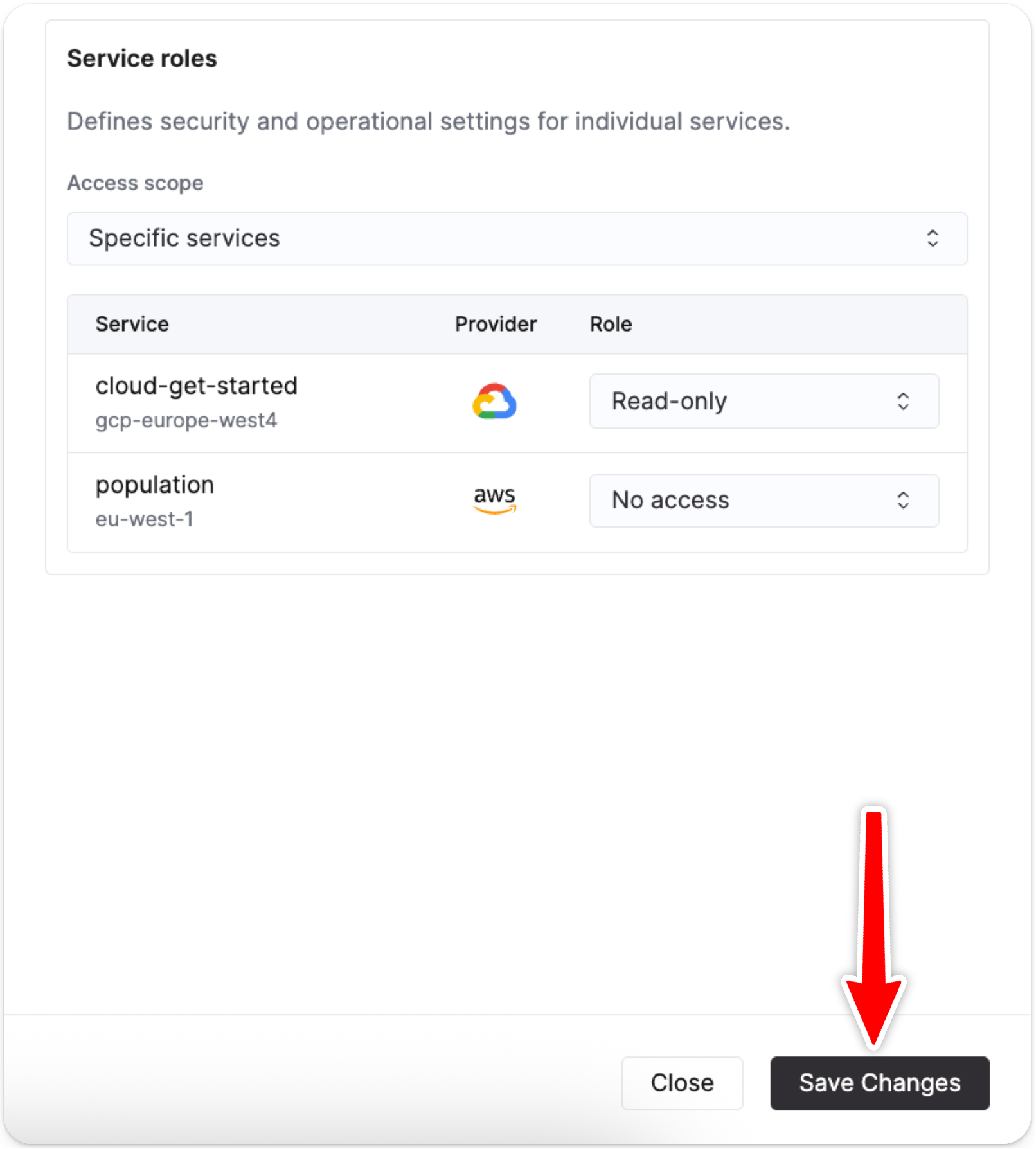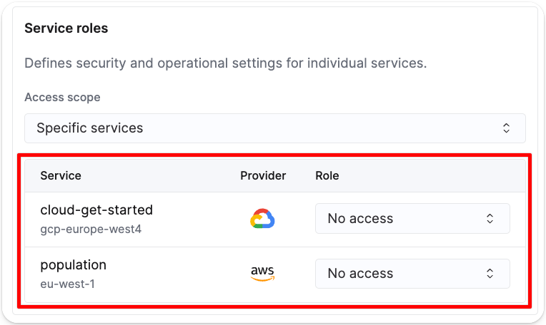 Select the drop-down menu items to adjust the access scope of the service role of the selected user. When selecting Specific services